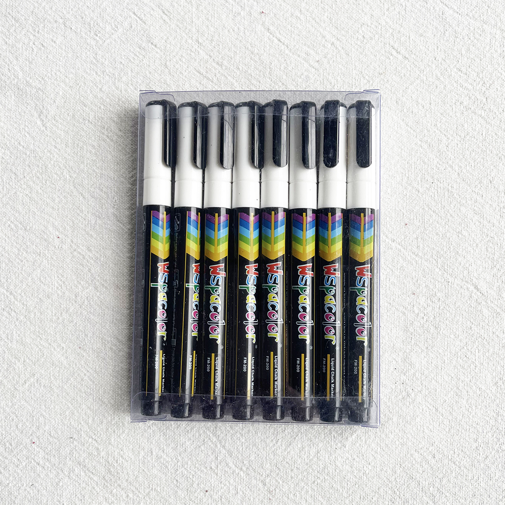 Im Gegensatz zu herkömmlichen Kreiden ist dieser Kreidestift flüssigkeitsbasiert. Dadurch entsteht eine gleichmäßige und klare Linie beim Schreiben, und er trocknet schnell, ohne Staub zu hinterlassen. Perfekt für detailreiche Zeichnungen, klare Schrift und kreative Projekte. Die Farbe lässt sich auch leicht mit einem Wunderschwamm abwischen, aber ein Mikrofasertuch funktioniert ebenso gut. Wenn der Text länger auf der Whiteboard bleibt, einfach den Schwamm oder das Tuch mit etwas Wasser befeuchten und danach trocken wischen. Diese Stifte haben eine abgerundete, etwas schmalere Spitze von 3 mm Durchmesser. Bei uns auf Wallrite.de kannst du sie im Set mit 8 Kreidestiften kaufen.
